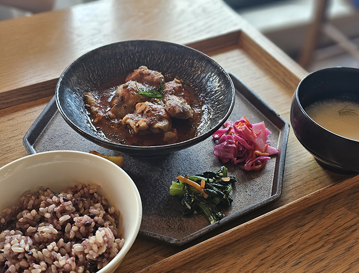 健康に育った鶏を熟成味噌で炊き上げました、五穀米とともに。